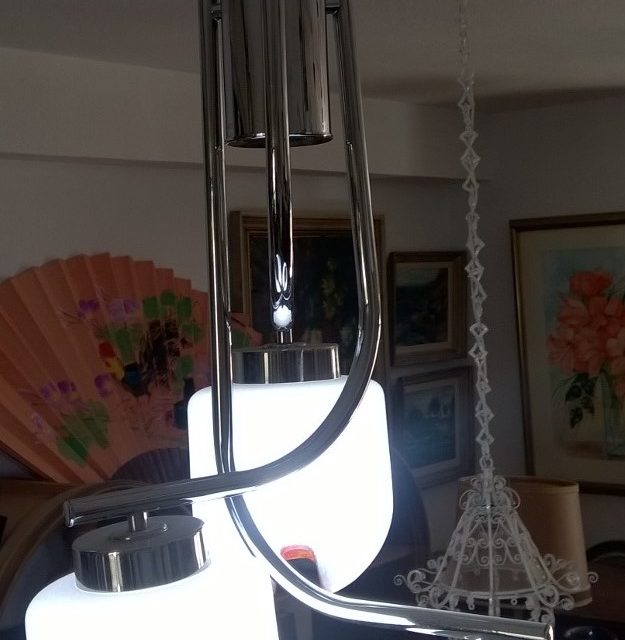 ATRACTIVA LÁMPARA EN ACERO CROMADO DE 3 BRAZOS ENTRELAZADOS Y 3 FOCOS ALARGADOS Y REDONDOS, CON FORMA REDONDA Y VARIACIÓN DE COLOR EN LA PARTE BAJA. SITUADOS EN TRES DESNIVELES Y DISEÑO MUY LOGRADO.